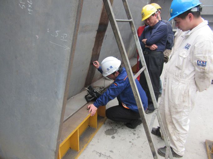 2015年3月31日,寧波市交通建設工程試驗檢測中心有限公司一行3人組成檢測組,前往位于江蘇省南通市如皋市的中國中鐵山橋重工集團有限公司,對在山橋公司生產(chǎn)的寧波梅山春曉大橋鋼桁架拱橋進行廠內抽檢。檢測組隨機抽取了已經(jīng)過自檢合格的焊縫進行超聲波無損檢測和X射線檢測(其中超聲波檢測25m,X射線拍片6張),并查看了第三方相關資料。檢測組與現(xiàn)場人員充分討論,并根據(jù)廠內焊接實際,大家一致認為自檢和第三方檢測對鋼結構非常重要,及時避免了不合格產(chǎn)品的出廠。